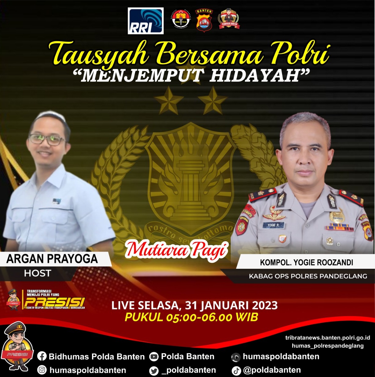 Serang, (suarasiber.co.id) – Kabag Ops Polres Pandeglang Kompol Yogie Roozandi menjadi narasumber dalam program Mutiara Pagi Tausyiah Bersama Polri yang diselenggarakan Radio Republik Indonesia (RRI) pada Selasa (31/01) sekitar pukul 05.00 Wib.