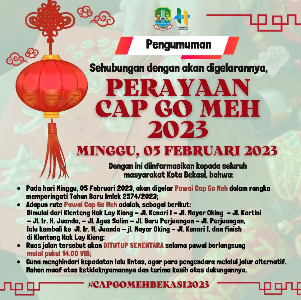 Perayaan Cap Go Meh di Kota Bekasi ini akan dilaksanakan dengan menutup beberapa jalan di Jl. Ir. H. Juanda. Warga yang akan melintas di jalan tersebut dapat memilih akses jalan alternatif lain,karena area ini akan ditutup pada 05 Februari 2023 mulai pukul 14.00 Wib.
