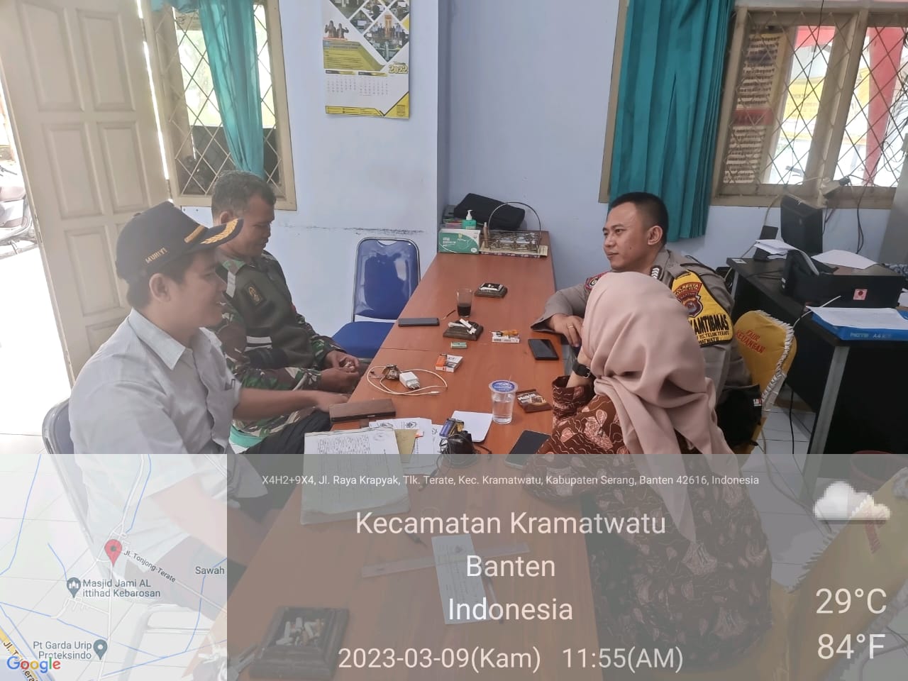 Bhabinkamtibmas Polsek Kramatwatu Polresta Serkot Bripka Angga melaksanakan patroli dialogis sekaligus sambang dan berdialog dengan kepala desa beserta staf di desa teluk terate Kec. Kramatwatu Kab. Serang berikan pesan-pesan Kamtibmas.