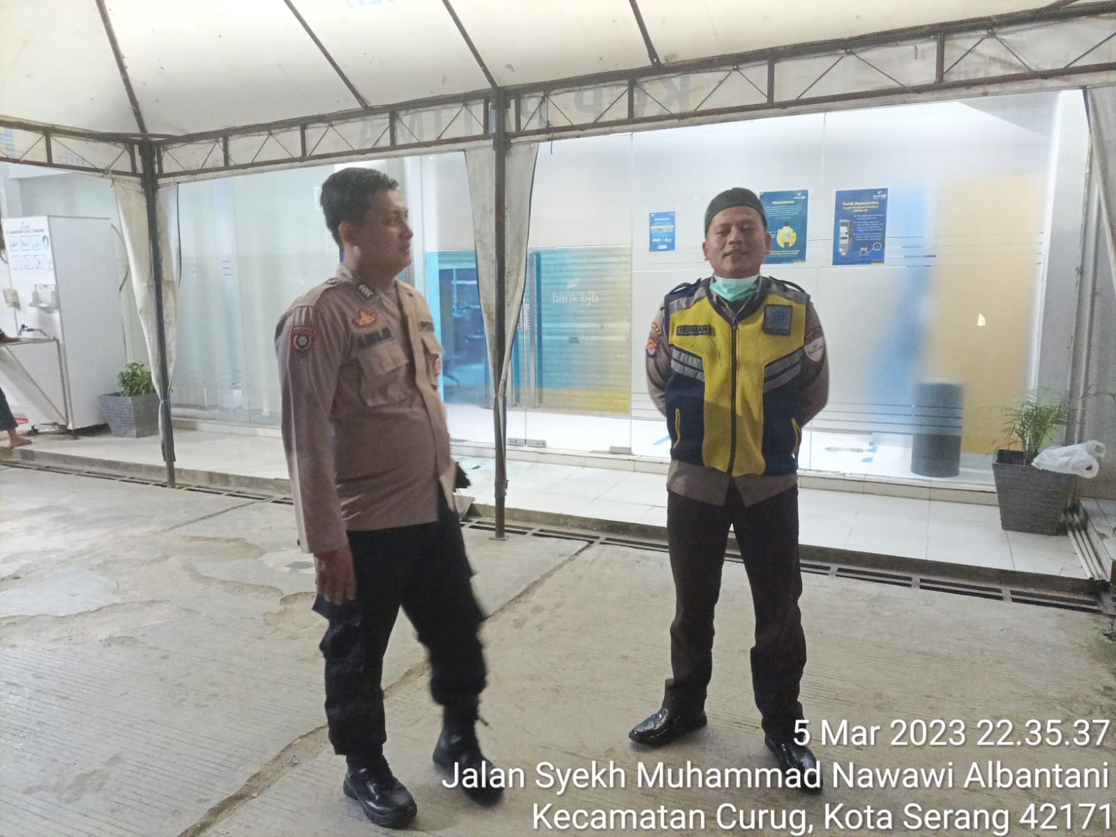 POLRESTA SERKOT_ Personel Polsek Curug Polresta Serkot Polda Banten melalui Bhabinkamtibmas Kel Sukawana Bripka Ikhsan S.H.sambangi satpam bank BJB dikantor cabang Bank BJB palima Kota Serang sampaikan pesan-pesan Kamtibmas. Senin(06/03/23)