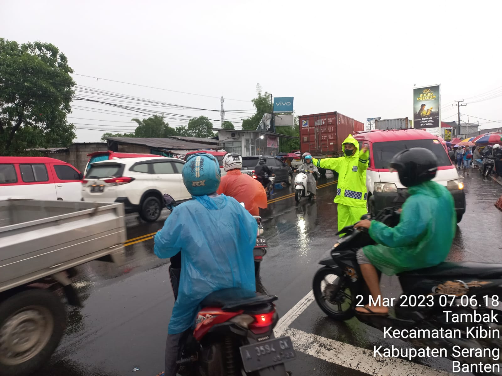 Rutinitas Personel Polsek Cikande Polres Serang melaksanakan kegiatan pelayanan pagi dengan penjagaan dan pengaturan (Gatur) arus lalu lintas untuk menciptakan keamanan, keselamatan , ketertiban dan kelancaran lalu lintas (Kamseltibcarlantas), Kamis (2/3/23) pagi