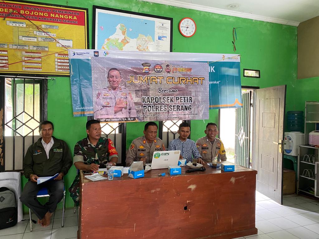 Kapolres Serang AKBP Yudha Satria. SH. S.IK melalui Kapolsek Petir AKP Uka Subakti. SH. MM menjelaskan dalam kegiatan Jumat Curhat Presisi dihadiri oleh Bhabinkamtibmas, Babinsa, para Ketua RT dan masyarakat Desa Bojong Nangka. Kegiatan Jumat Curhat Persisi kami dengan cara mendatangi Kantor Desa Bojong Nangka Kecamatan Petir.