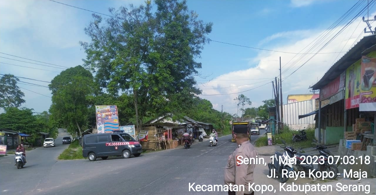 SERANG, (suarasiber.co.id) – Pengaturan lalu lintas adalah merupakan salah satu bentuk pelayanan Kepolisian kepada masyarakat di jalan raya, dalam memberikan rasa aman bagi pengendara dan penyebrang jalan Polsek Kopo Polres Serang melaksanakan pengaturan lalu lintas di Jl. Raya Kopo Maja Kec. Kopo Kab. Serang. Senin, (01/05/2023). 07.00 WIB.