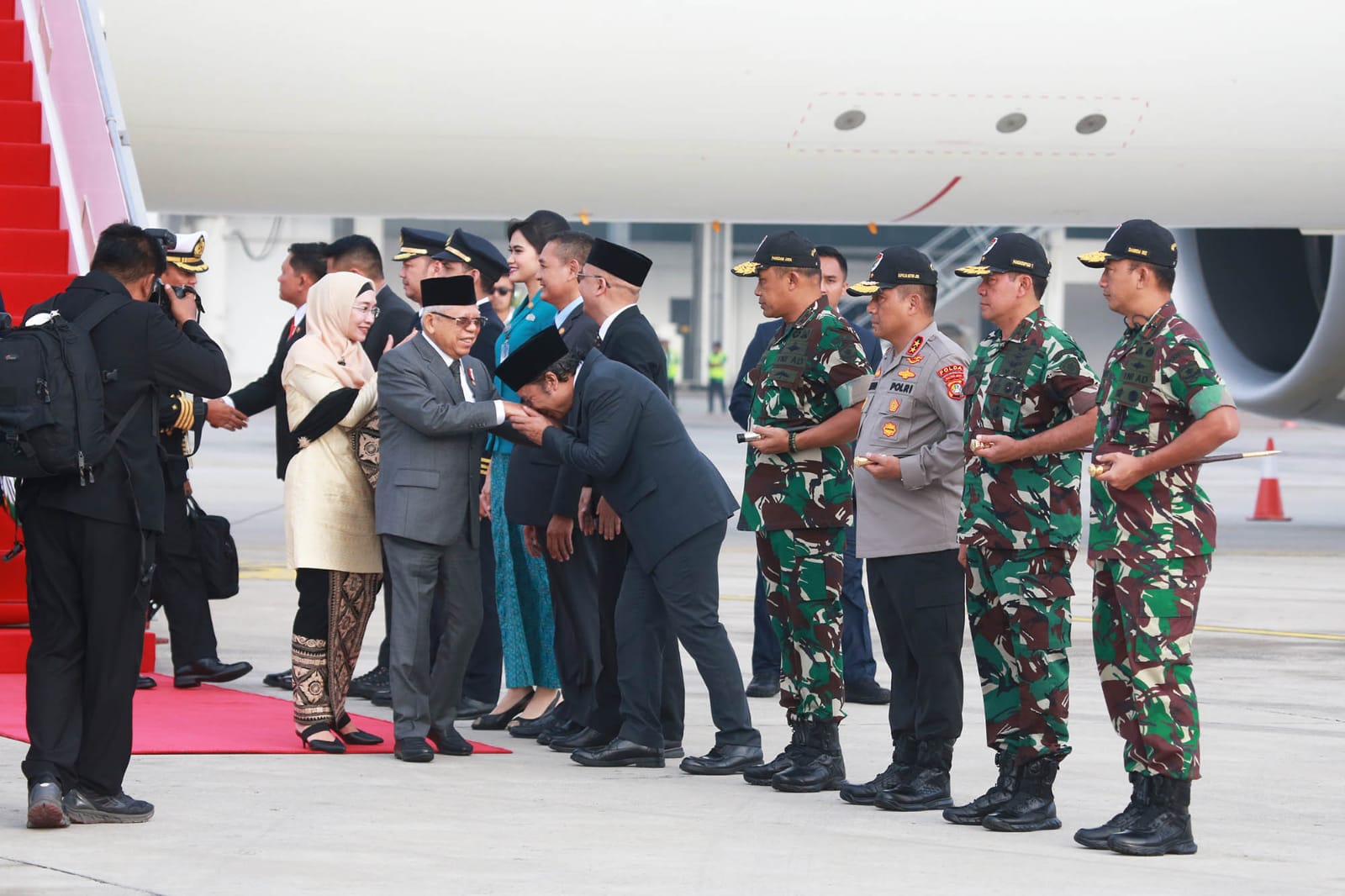 Tampak turut hadir menyambut Wapres, Pangdam Jaya Mayjen TNI Mohammad Hasan, Kapolda Metro Jaya Irjen Pol. Karyoto, dan Panglima Komando Operasi Udara I Marsda TNI Bambang Gunarto.