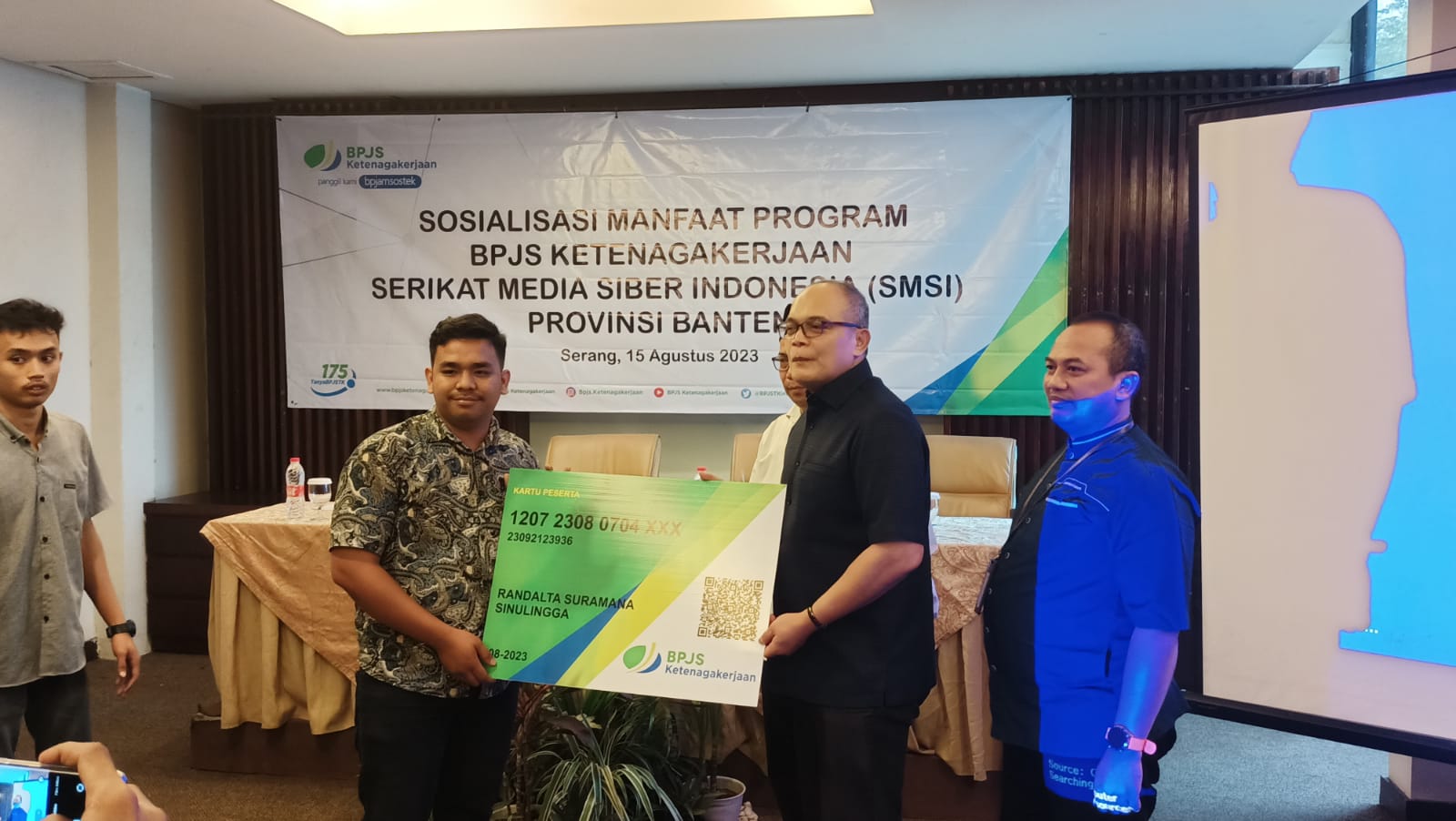 Untuk diketahui bahwa pada kegiatan sosialisasi ini, BPJS Ketenagakerjaan Cabang Serang memberikan secara simbolis kartu kepesertaan kepada Randal yang merupakan wartawan dari media Suarasiber.co.id dan Nandi yang merupakan wartawan dari media beritasiber.co.id.