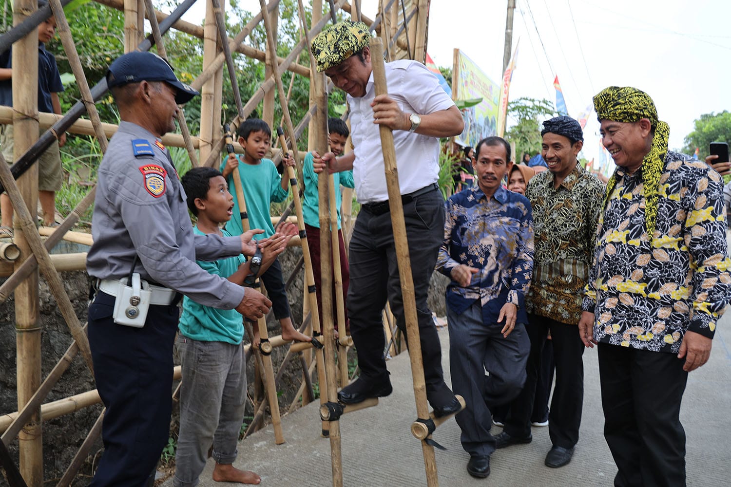 Kedatangan Menparekraf Sandiaga Salahuddin Uno dan Pj. Gubernur Banten Al Muktabar disambut dengan pemasangan ikat kepala (Lomar) khas Desa Cikolelet, pertunjukan pentas seni tradisional Desa Cikolelet serta pameran Ekonomi kreatif dan UMKM. (*)