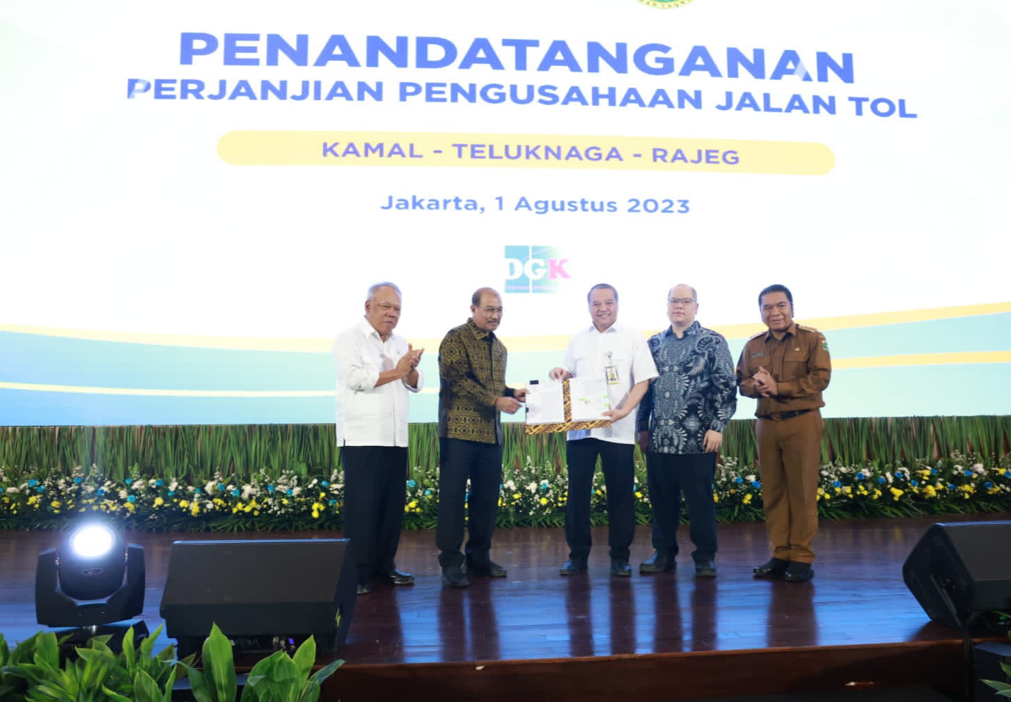Sebagai informasi, penandatangan dilakukan oleh Direktur PT Duta Graha Karya Nono Sampono dan Kepala Badan Pengatur Jalan Tol (BPJT) Miftachul Munir. Disaksikan oleh Menteri PUPR Basuki Hadimuljono, Pj Gubernur Banten Al Muktabar, dan Direktur Agung Sedayu Grup Yohanes Edmond Budiman.