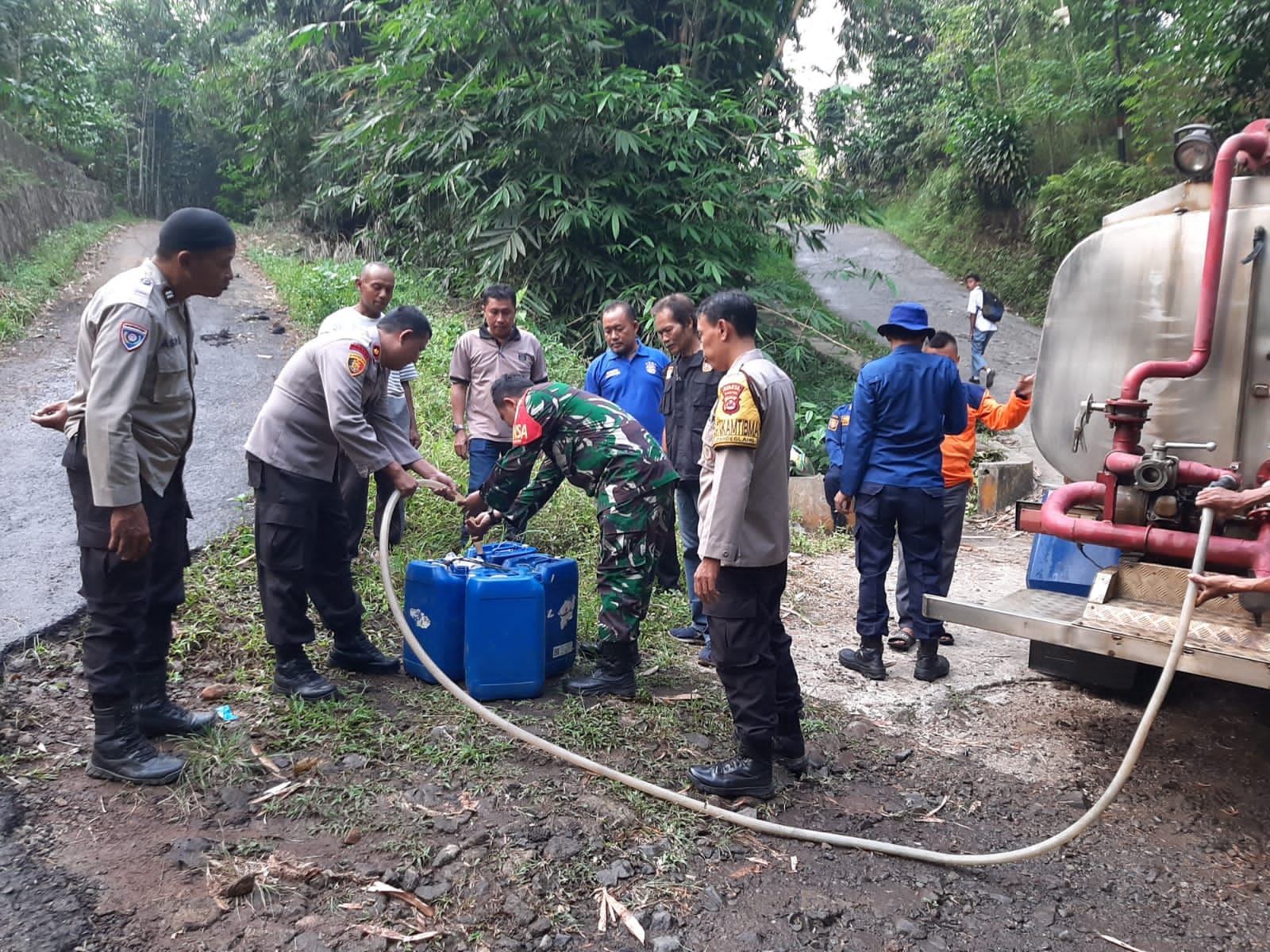 Pendistribusian bantuan air bersih di kampung Mauk Mangkubumi Pandeglang sangat membatu warga yang kesulitan mendapatkan air bersih, tampak puluhan ember dan jeriken berjejer di mobil tangki, Babinsa Sertu Asep Kuntoro dan petugas langsung mengisi satu-persatu ember dan jeriken secara bergantian.