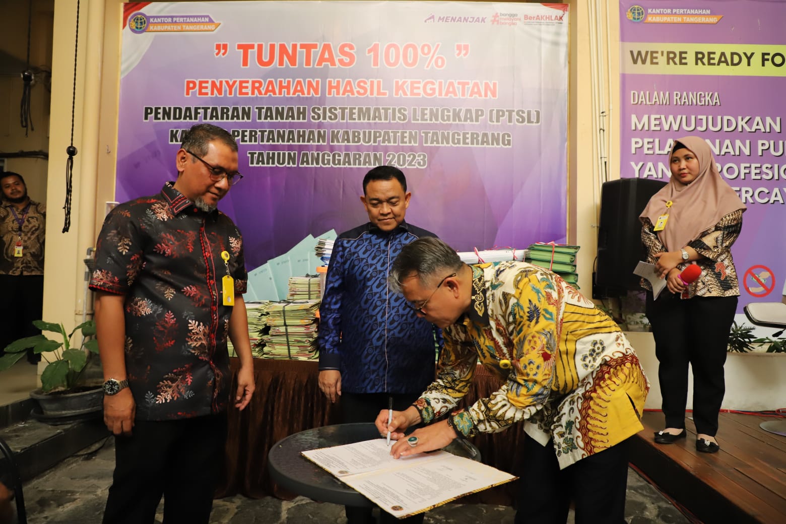 “Hari ini kita akan dilakukan penyerahan hasil dari Ketua Tim Ajudikasi PTSL 2023, Saudara Wendi Suparto kepada kepala kantor pertanahan disaksikan oleh Kakanwil BPN Banten,” ujar Kepala Kantor Pertanahan Kabupaten Tangerang, Joko Susanto dalam sambutannya.