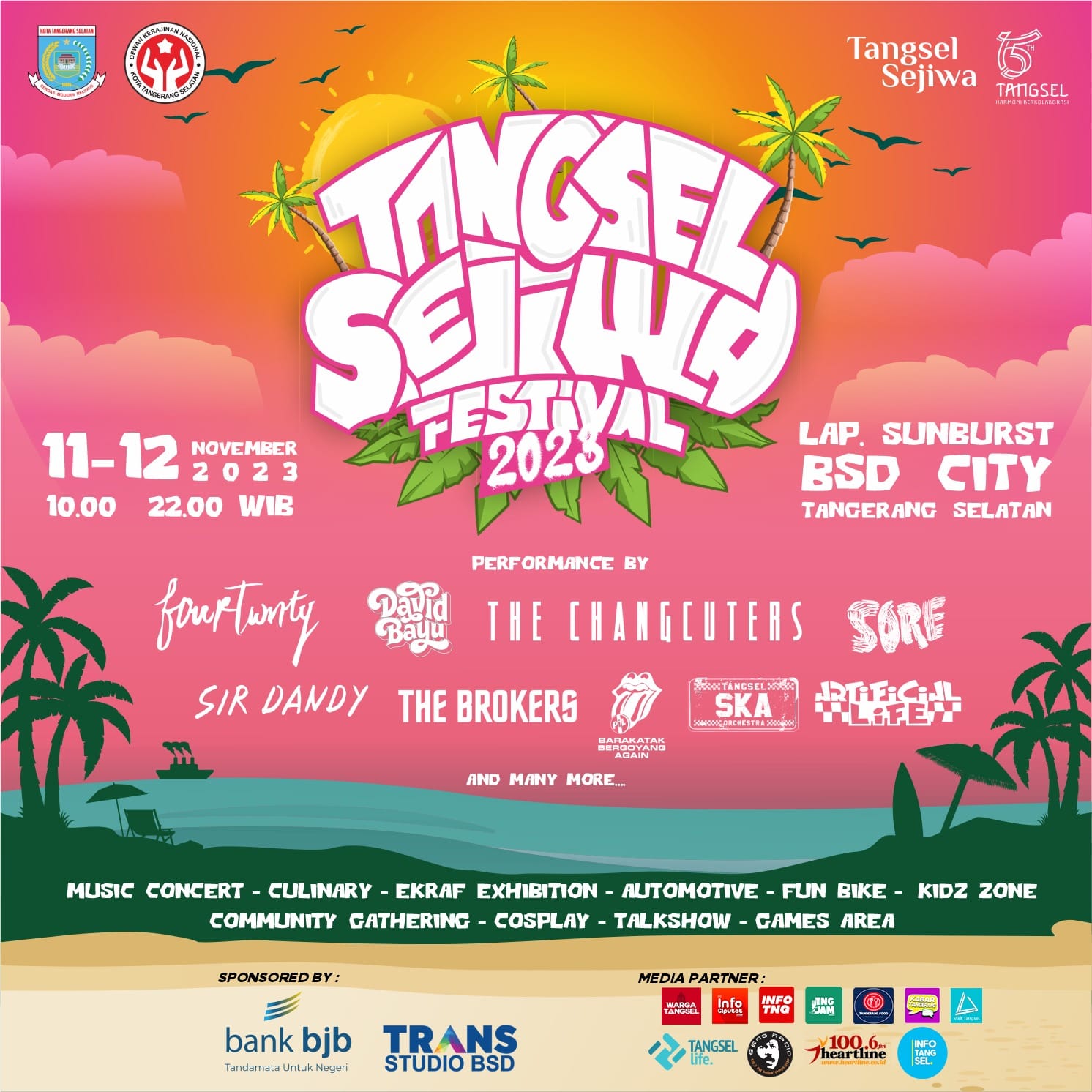 Dengan mengusung semangat Harmoni Kolaborasi, Tangsel Sejiwa Fest akan digelar selama dua hari, 11-12 November 2023, yang berlokasi di Lapangan Sunburst, BSD Serpong.