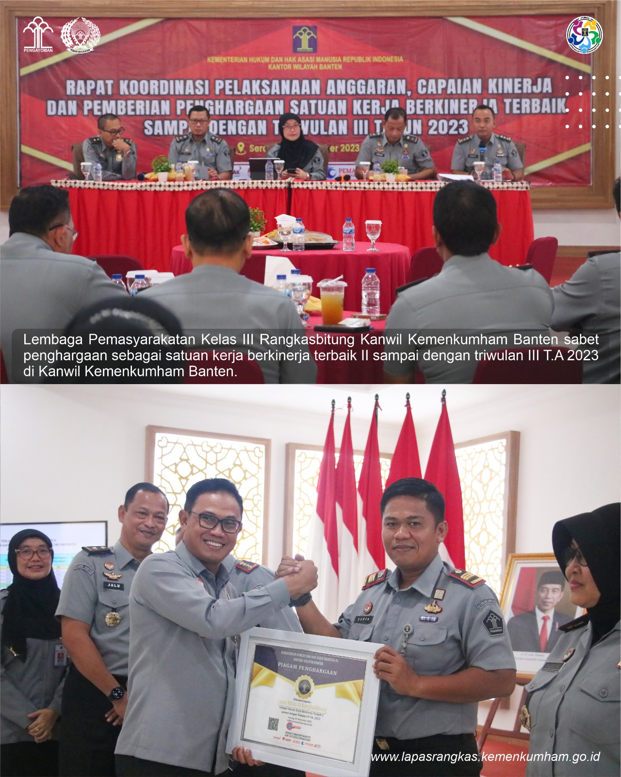 LEBAK, (suarasiber.co.id) -Lembaga Pemasyarakatan Kelas III Rangkasbitung Kanwil Kemenkumham Banten kembali menorehkan prestasi gemilang di tahun 2023, kali ini berhasil menyabet penghargaan bergengsi sebagai satuan kerja berkinerja terbaik II sampai dengan triwulan III T.A 2023 di Kanwil Kemenkumham Banten, Senin (06/11).