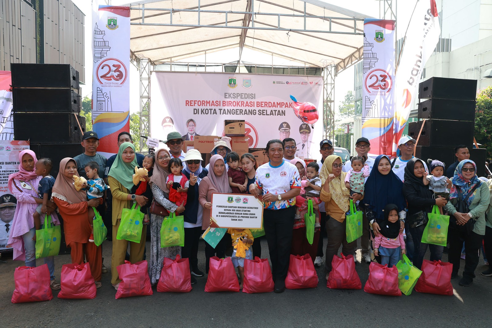 BANTEN, ( suarasiber.co.id ) – Rangkaian HUT Ke-23 Provinsi Banten, Pemerintah Provinsi (Pemprov) Banten menyalurkan Bantuan Sosial (Bansos) pada program penanganan kemiskinan ekstrem dalam rangka Ekspedisi Reformasi Birokrasi Tematik Berdampak di Lapangan Mall Pelayanan Publik (MPP) Kota Tangerang Selatan, Minggu (19/11/2023).