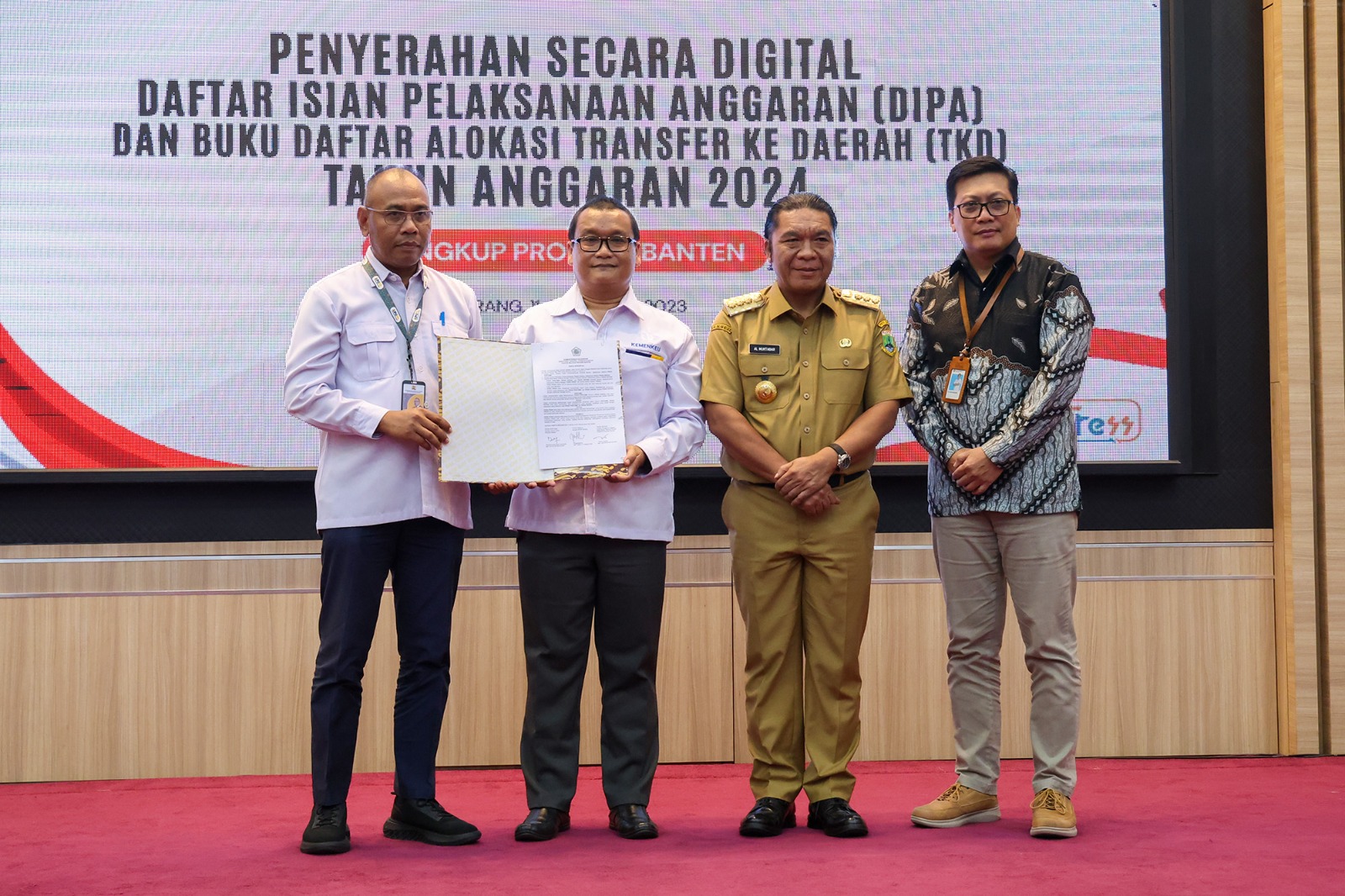SERANG, (suarasiber.co.id) – Penjabat (Pj) Gubernur Banten Al Muktabar menyerahkan Daftar Isian Pelaksanaan Anggaran (DIPA) dan Daftar Alokasi Transfer ke Daerah (TKD) Tahun Anggaran (TA) 2024 kepada Pimpinan Instansi Vertikal dan Kepala Daerah di lingkup Provinsi Banten. Penyerahan bertempat di Pendopo Gubernur Banten, KP3B, Kota Serang, Senin (11/12/2023).
