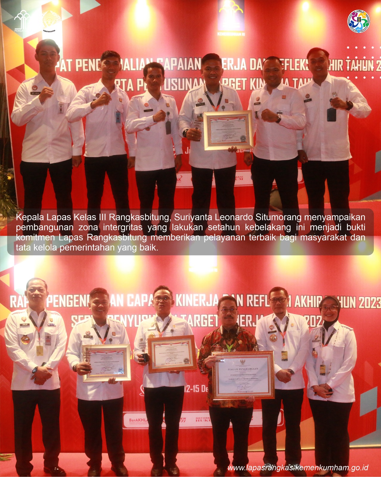 Penyerahan predikat WBK dalam acara Pemberian Penghargaan Pelaksanaan Reformasi Birokrasi di Lingkungan Kementerian Hukum dan Hak Asasi Manusia Tahun 2023 turut dihadiri oleh Ditjen Pemasyarakatan, Kakanwil Kemenkumham Banten dan 72 Satker yang mendapat predikat WBK se-indonesia
