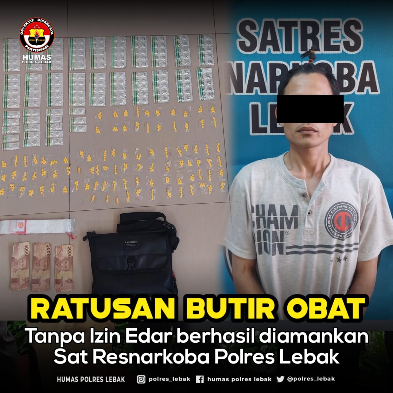 LEBAK,(suarasiber.co.id) – Ratusan butir obat tanpa izin edar berhasil diamankan Jajaran Sat Resnarkoba Polres Lebak Polda Banten.