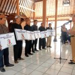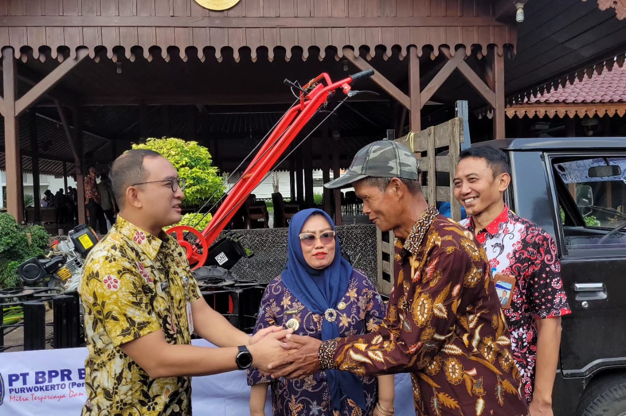 Pj Bupati Banyumas Hanung Cahyo Saputro dengan didampingi Pj Sekda Banyumas Junaidi dan Direktur Utama Bank BKK Purwokerto Sugeng Prijono menyerahkan hand traktor kepada Kepala Desa Karangendep Karsinah dengan didampingi Ketua Kelompok Tani Karisun Selasa (16/01/2023) di Halaman Pendopo Si Panji Purwokerto.