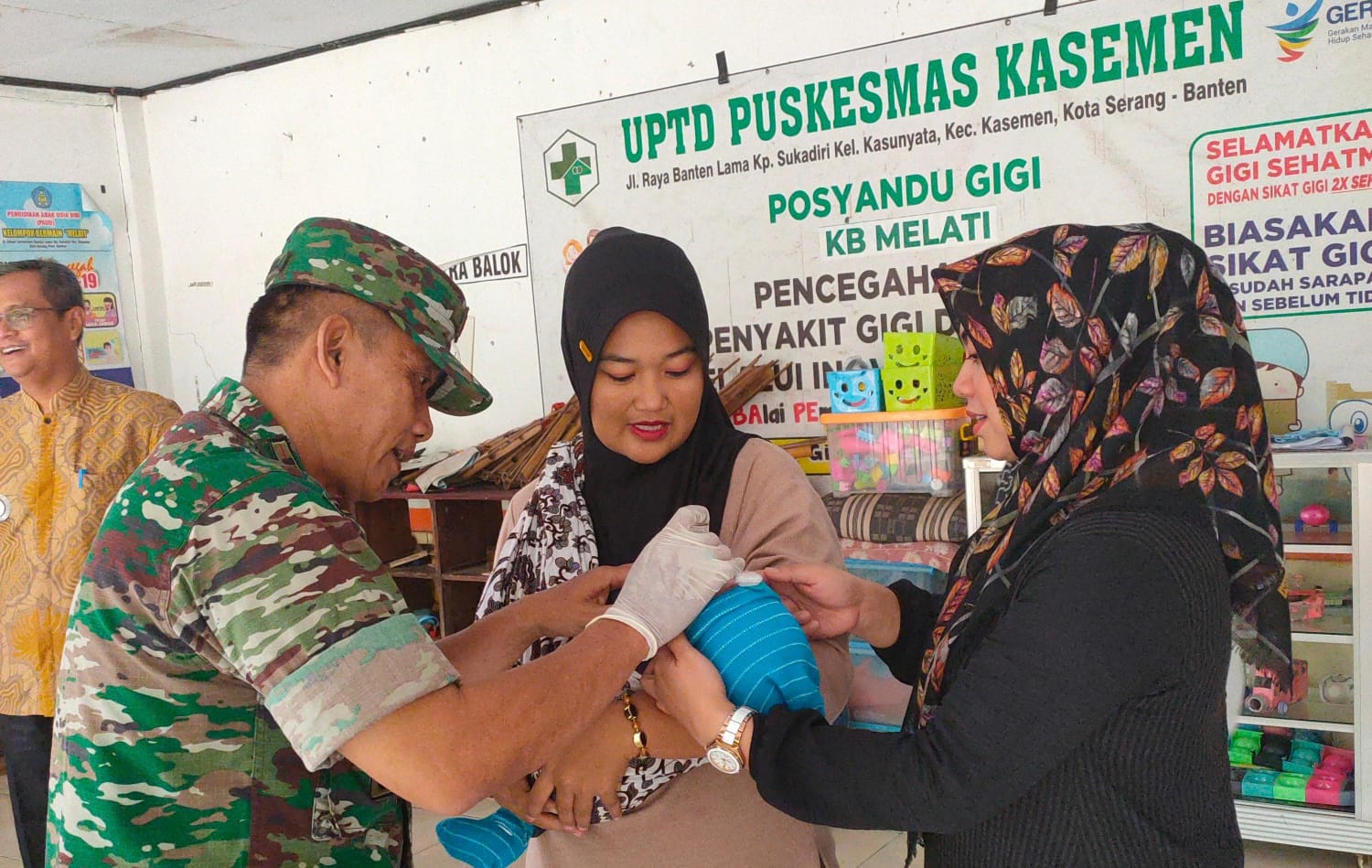 Komandan Koramil (Danramil) 0602-02/Serang, Kodim 0602/Serang, Letnan Satu (Lettu) Inf Dadan Ramdani, bersama seluruh Bintara Pembina Desa (Babinsa), aktif membantu dan mendampingi petugas Puskesmas dalam melaksanakan program imunisasi ini, bertempat di Posyandu Melati dan PAUD Melati, Kelurahan Kasunyatan Kecamatan Kasemen Kota Serang, Provinsi Banten, Jumat (26/07/2024)