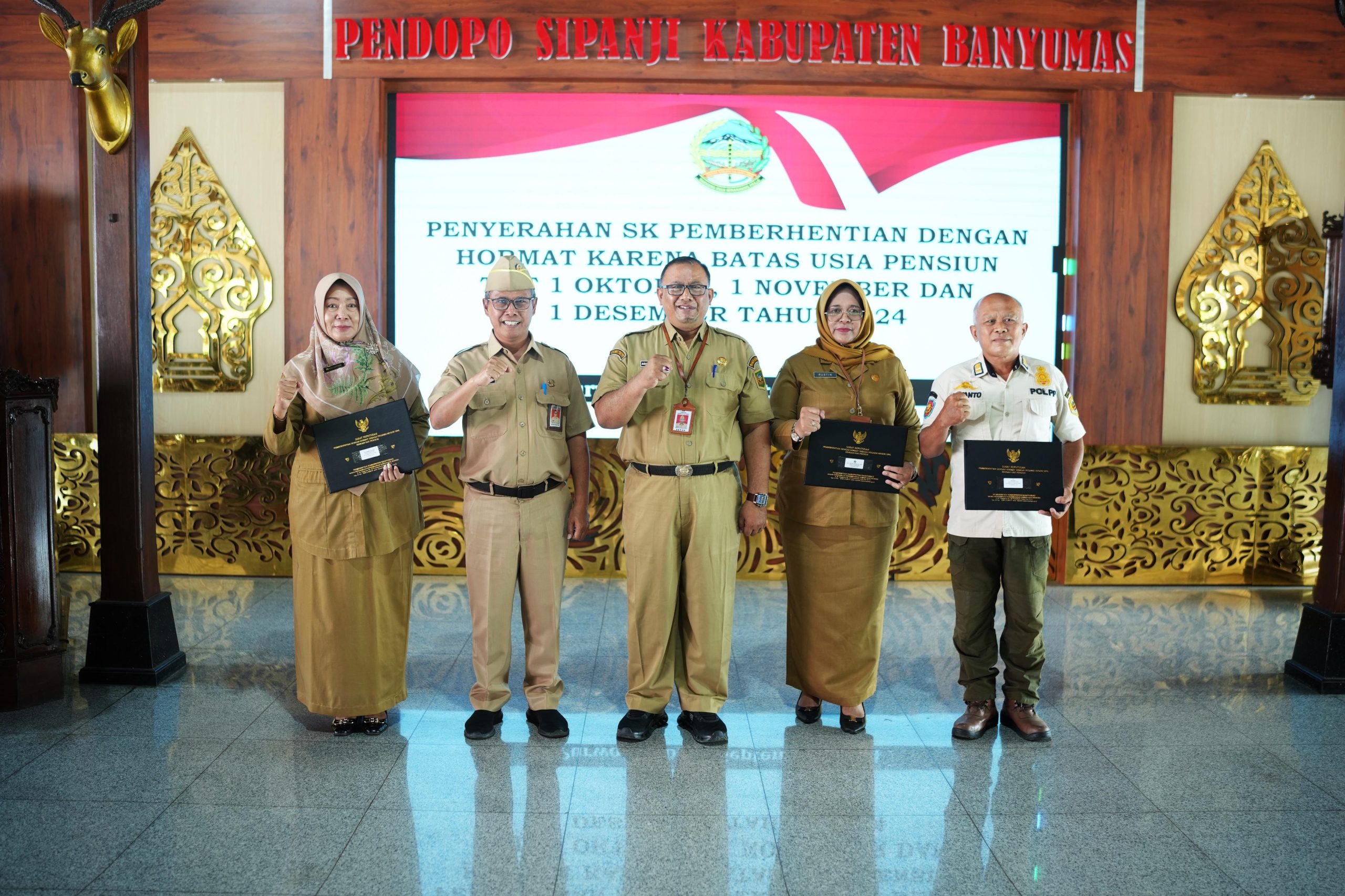 Sekretaris Daerah Kabupaten Banyumas Agus Nur Hadie menyerahkan SK Pemberhentian dengan hormat karena batas usia pensiun kepada 163 pegawai di Lingkungan Pemkab Banyumas dengan TMT bulan Oktober Nopember dan Desember 2024 di Pendopo Si Panji Purwokerto pada Senin (30/09/2024). Adapun penerima SK Pensiun sebanyak 163 orang terdiri dari dari PNS guru dan non guru. SK Pensiun langsung diserahkan Sekda Banyumas disaksikan oleh seluruh hadirin yang datang pada acara tersebut.