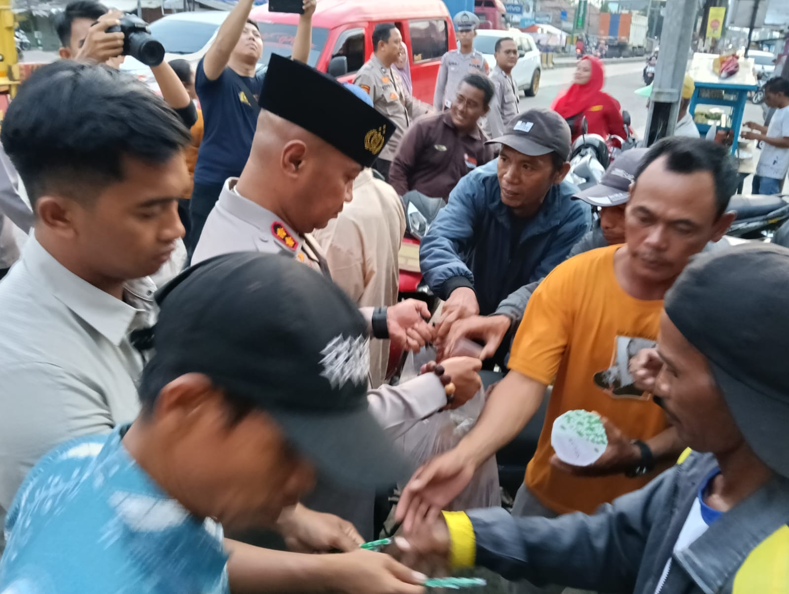 Sebelum berbuka puasa bersama, Kapolres bersama personil Polsek Ciruas membagikan takjil kepada puluhan pengojek pangkalan serta buruh pabrik yang turun dari angkutan umum.