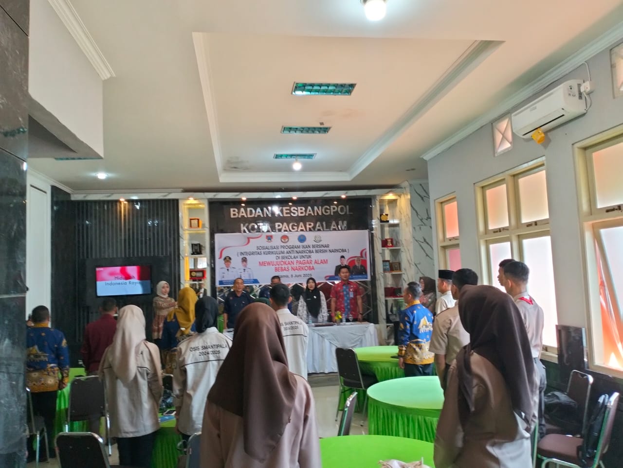 PAGARALAM, – (Suarasiber.co.id) Badan Kesatuan Bangsa dan Politik (Kesbangpol) Kota Pagar Alam bekerja sama dengan Badan Narkotika Nasional (BNN) Kota Pagar Alam menggelar kegiatan Sosialisasi Program IKAN BERSINAR (Integrasi Kurikulum Anti Narkoba Bersih Narkoba) di sekolah,Kegiatan diikuti oleh siswa SMA, guru, dosen, mahasiswa, serta jajaran instansi pemerintah dan lembaga terkait. Kamis (05/06/2025)