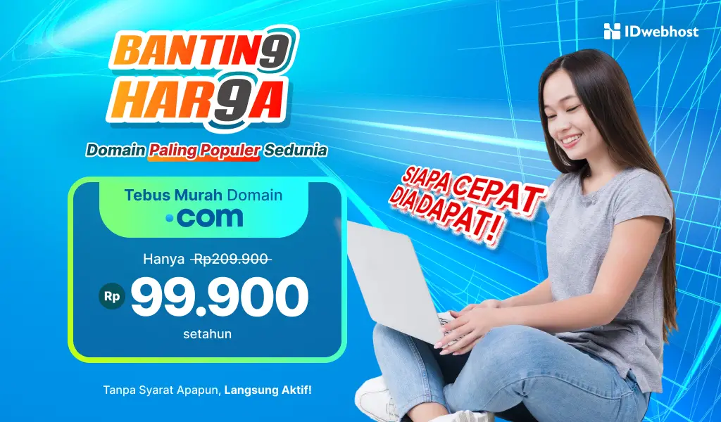 Selama bulan kemerdekaan ini, IDwebhost menawarkan promo istimewa: domain .COM hanya Rp99.900 untuk satu tahun pendaftaran pertama. Promo ini berlaku dari 1 Agustus hingga 31 Agustus 2025.