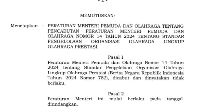“Secara bersamaan, setelah mempertimbangkan masukan stakeholder dunia olahraga, diskusi dengan banyak pihak yang mengerti dari segi hukum nasional dan internasional, kita putuskan mencabut, Permenpora No 14 tahun 2024. Langkah deregulasi ini juga sejalan dengan semangat reformasi birokrasi dan penyederhanaan regulasi yang digalakkan Presiden Prabowo Subianto untuk menciptakan ekosistem olahraga yang lebih dinamis, inklusif, dan berdaya saing global,” imbuhnya.