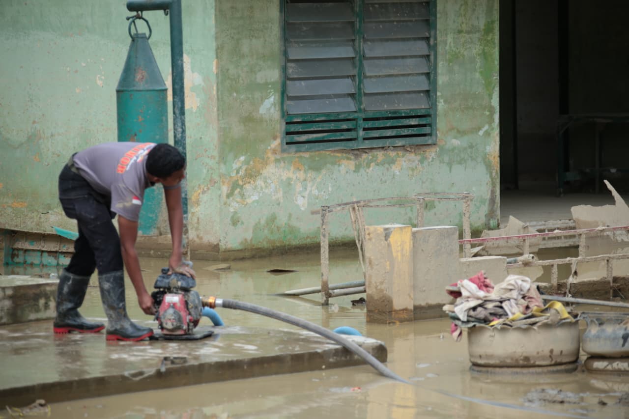 Hari ini Pasukan gabungan Korbrimob Polri dan Brimob Polda Aceh mengerahkan Personel dan peralatan yang dimiliki untuk membantu menguras air yang menggenang di Markas Komando Kompi Senapan A Yonif 111 / Karma Bakti, Aceh Tamiang.